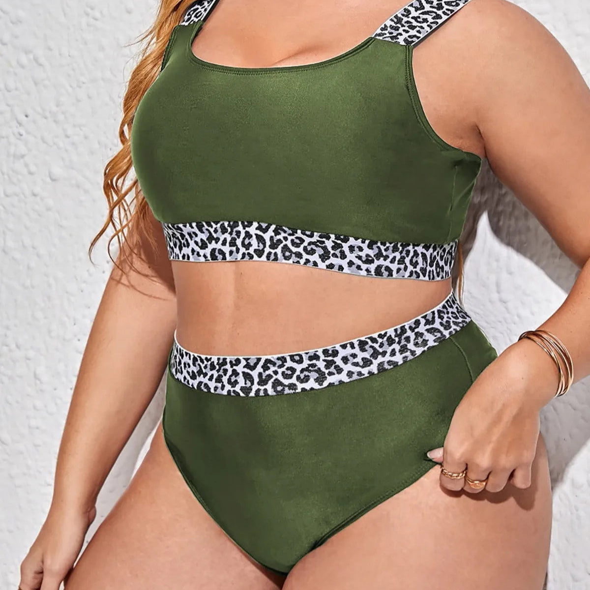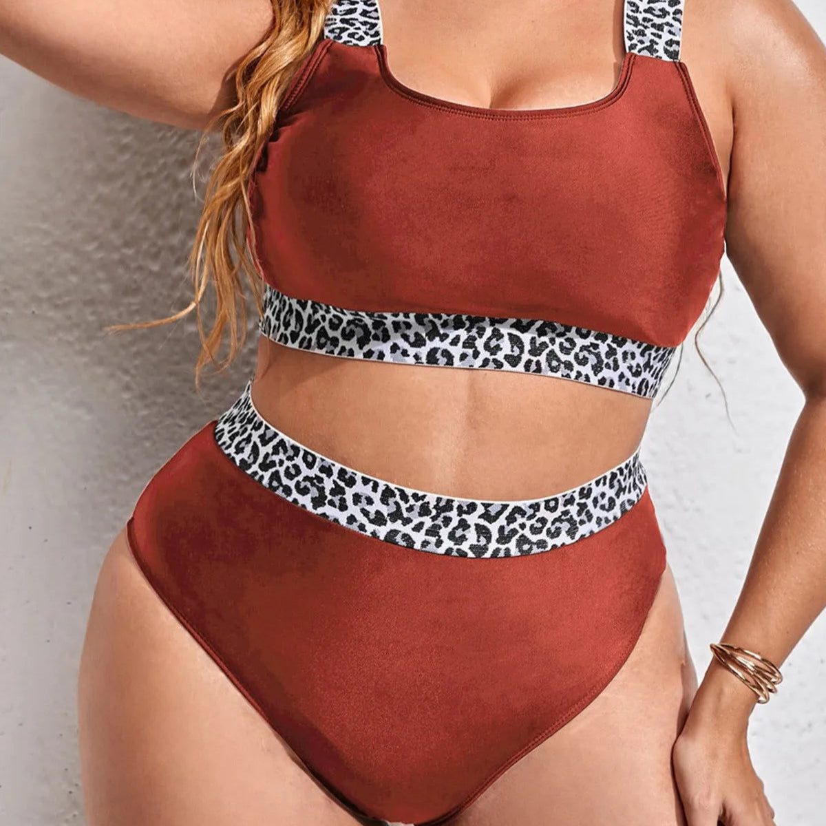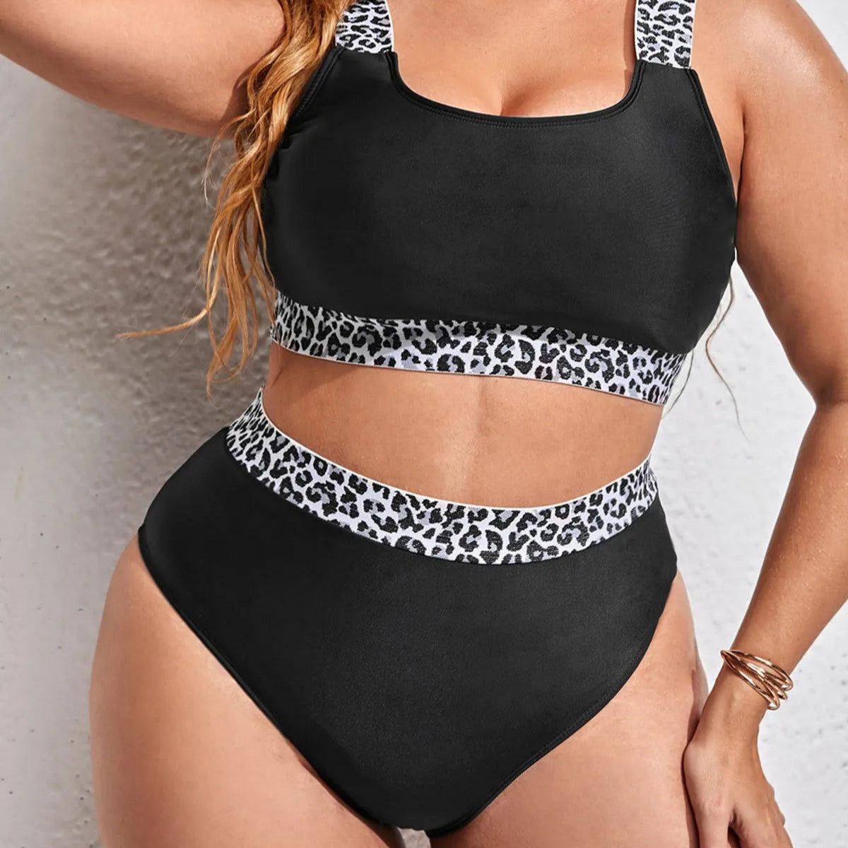 Leopard Trim Plus Size Bikini – Scoop Neck & High-Waist Bottom