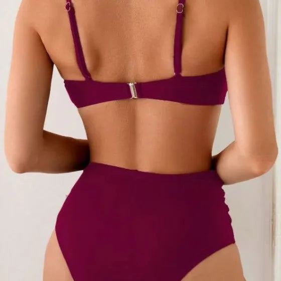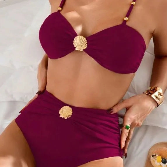 Elegant and unique, this high-waist bikini was designed to bring sophistication to the beach. The bottom features a delicate shell detail at the waistband, creating a subtle ruched effect, while the top is beautifully united by a central shell between the cups. Adjustable straps with metallic accents add a premium touch, making this set the perfect balance between exclusivity and charm. Available in refined color tones, it’s the statement piece your summer wardrobe deserves.