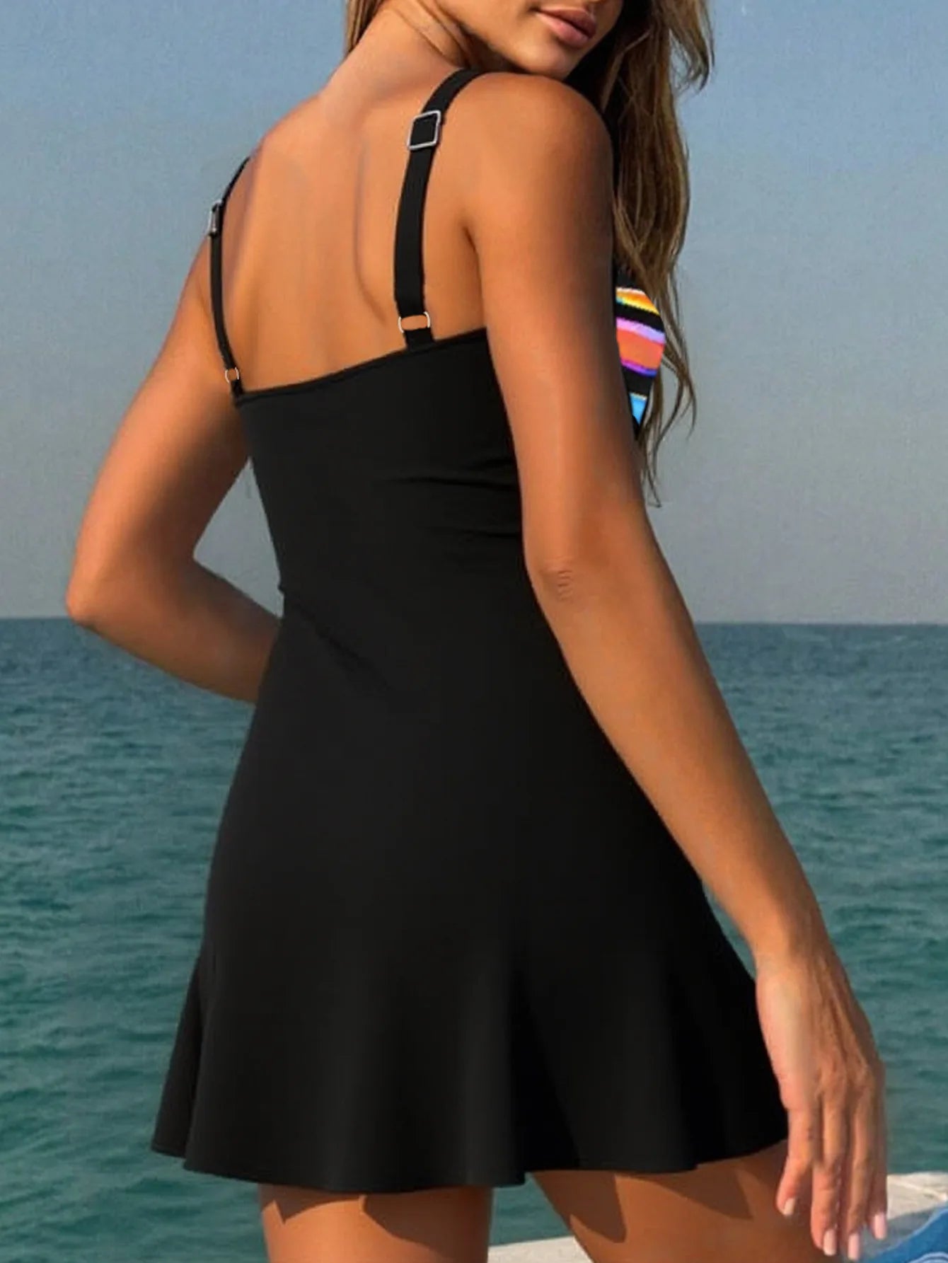 This chic tankini combines elegance and comfort with a flattering wrap-front design. The striped bodice features a side tie detail that allows gentle ruching for a customizable fit. Adjustable straps provide support, while the straight-cut back keeps the look sleek and modern. Paired with a solid-color skirt bottom, this set delivers both coverage and style, making it a perfect choice for beach, pool, or resort wear.
