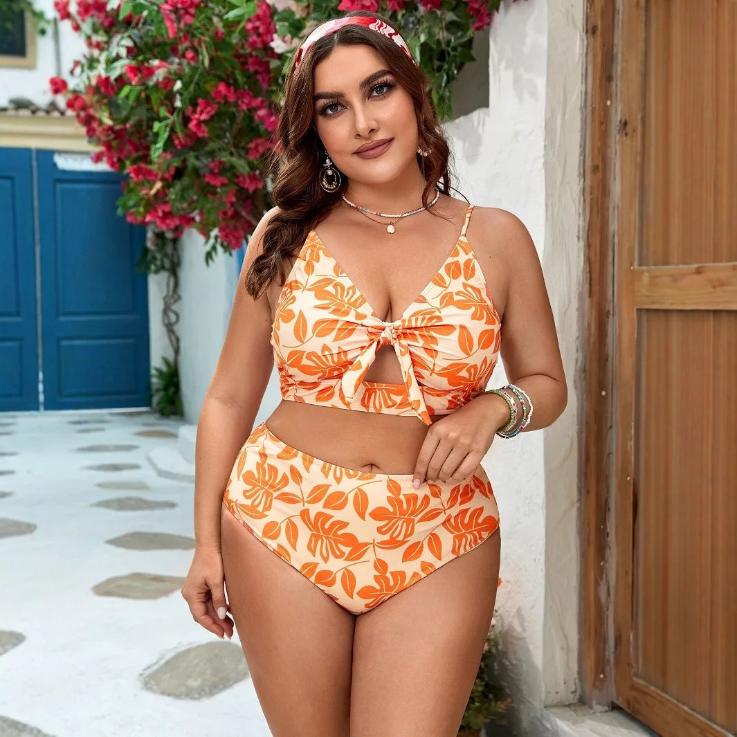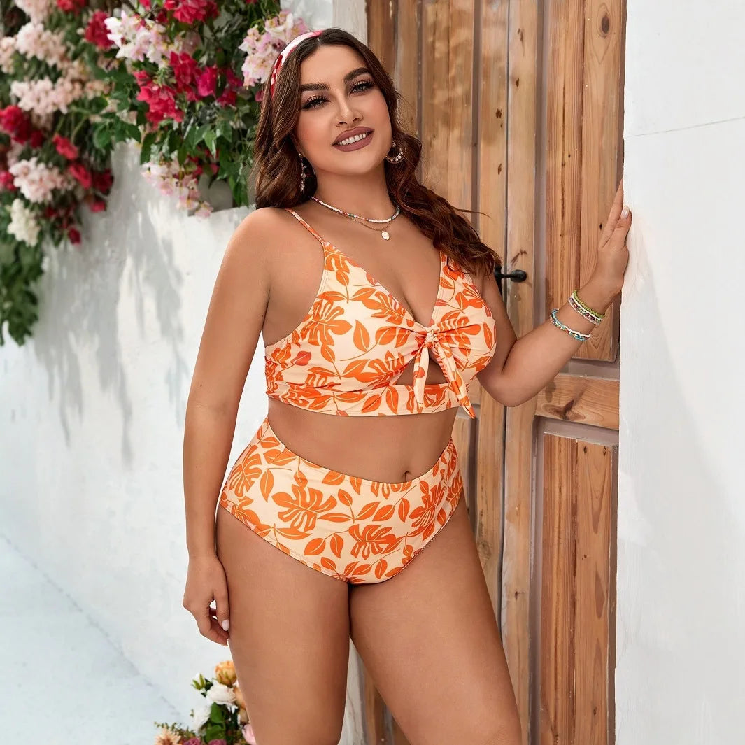 Bright and feminine, this plus size bikini features a vibrant orange floral print that radiates summer style. The V-neck top includes a central knot that ties the bust together, creating a cut-out for a flirty touch. Slim fixed straps complete the look with a clean finish. The matching high-waist bottom provides comfortable coverage while keeping the playful floral pattern consistent throughout the set.