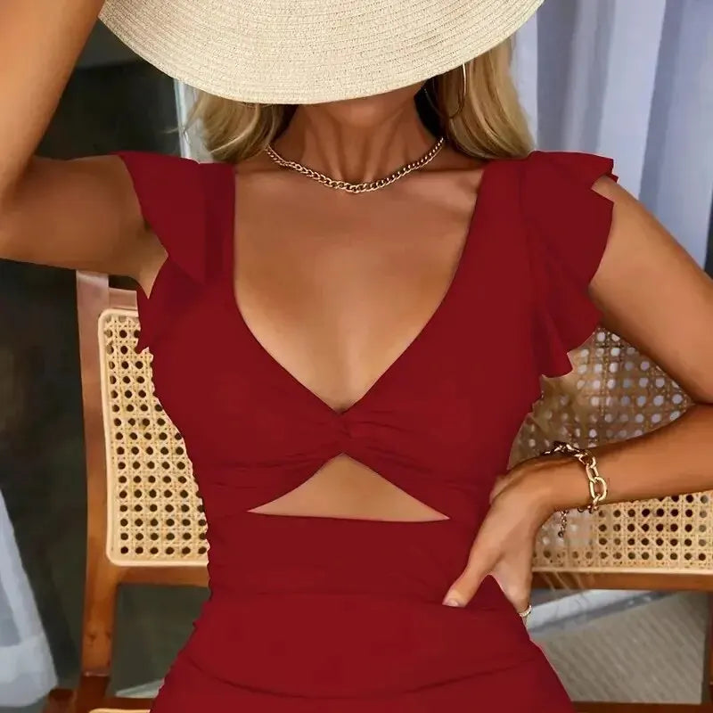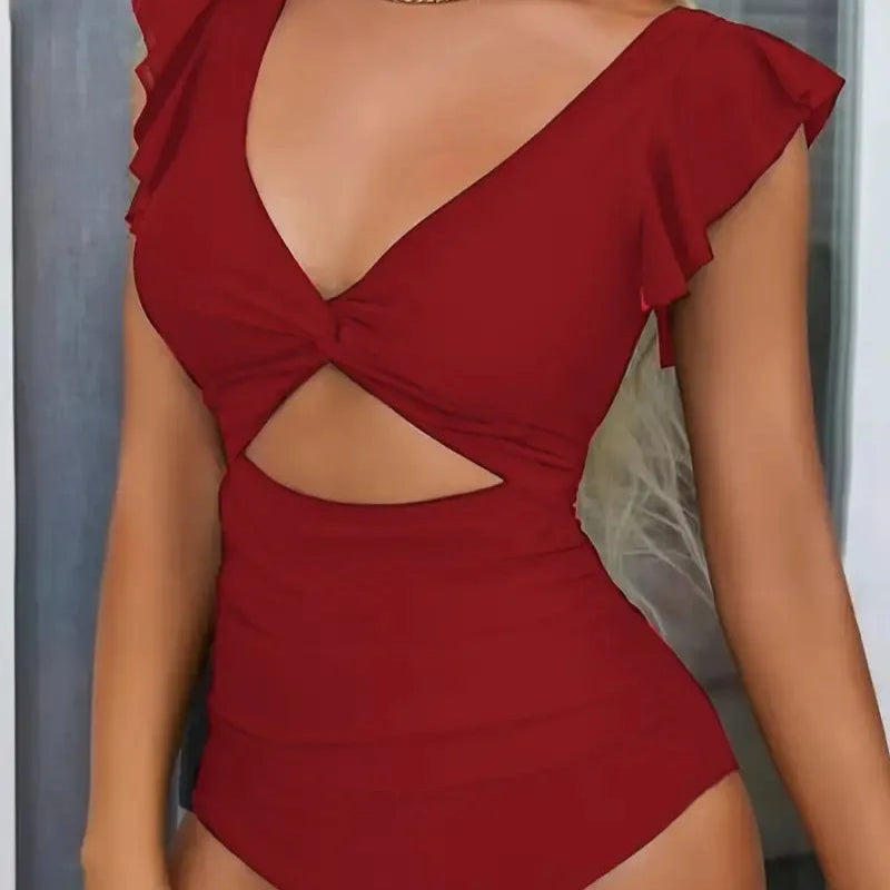 A luxurious and elegant one-piece swimsuit designed with a twisted V-neck bust that creates a chic cut-out at the midriff. The back features a deep plunge with a snap closure and an additional cut-out below, revealing the back with sophistication. Delicate ruffles on the non-adjustable straps bring a couture-inspired touch, while the high-waisted bottoms with side ruching sculpt a refined silhouette. A timeless piece for women seeking exclusivity and style at the beach or pool.