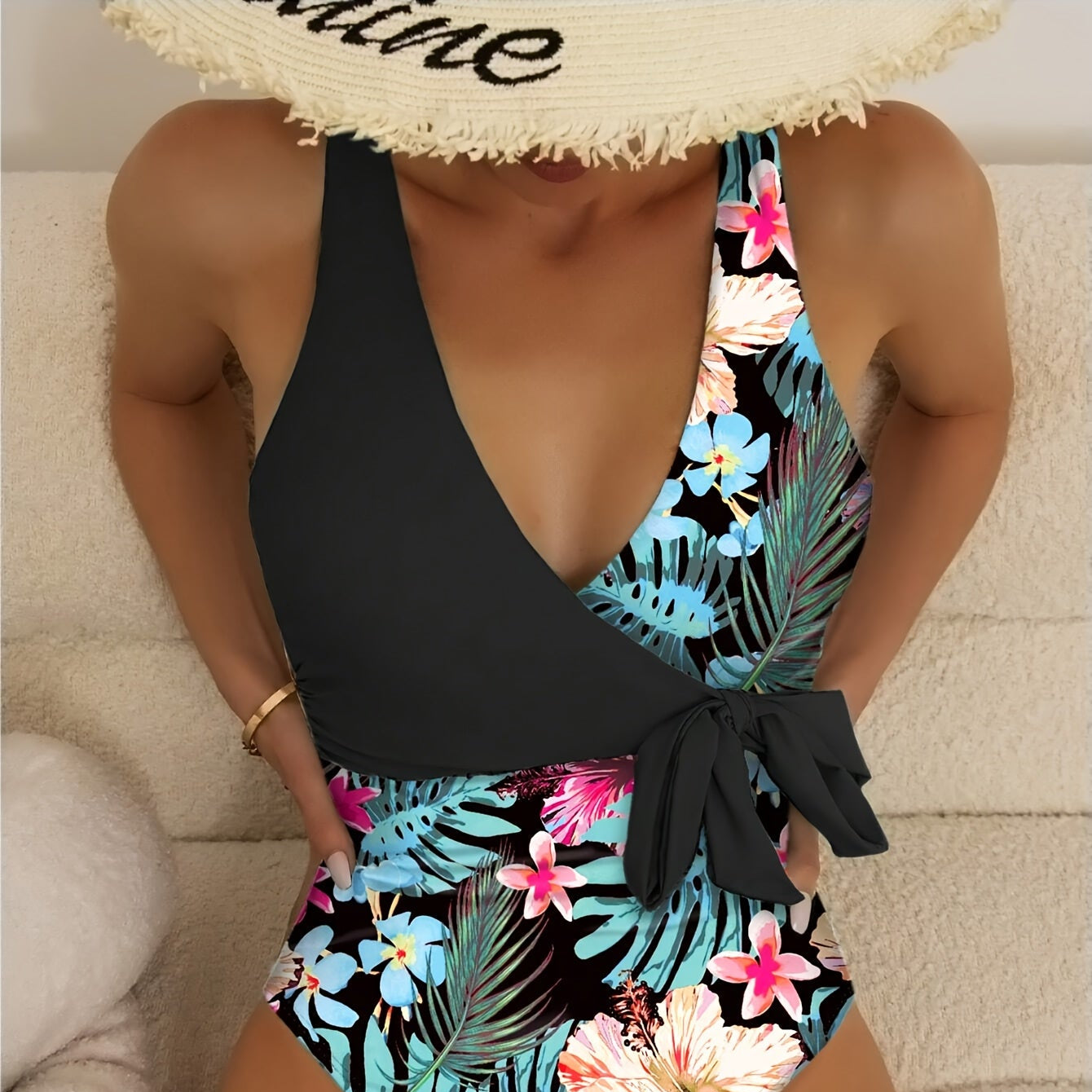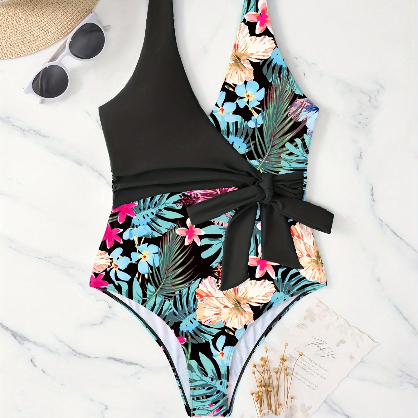 A vibrant and elegant one-piece swimsuit featuring a tropical floral print in black and pink. Designed with a high-waist silhouette at the waist for a flattering fit. Made with high-stretch fabric for comfort and flexibility, perfect for beach days, poolside lounging, and summer vacations.