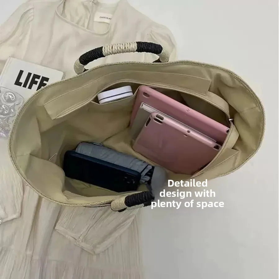 Resort-ready and spacious. A striped woven-straw bucket tote with wrapped ring handles and an inner zip pocket—ideal for beach days, weekend escapes, and everyday carry.