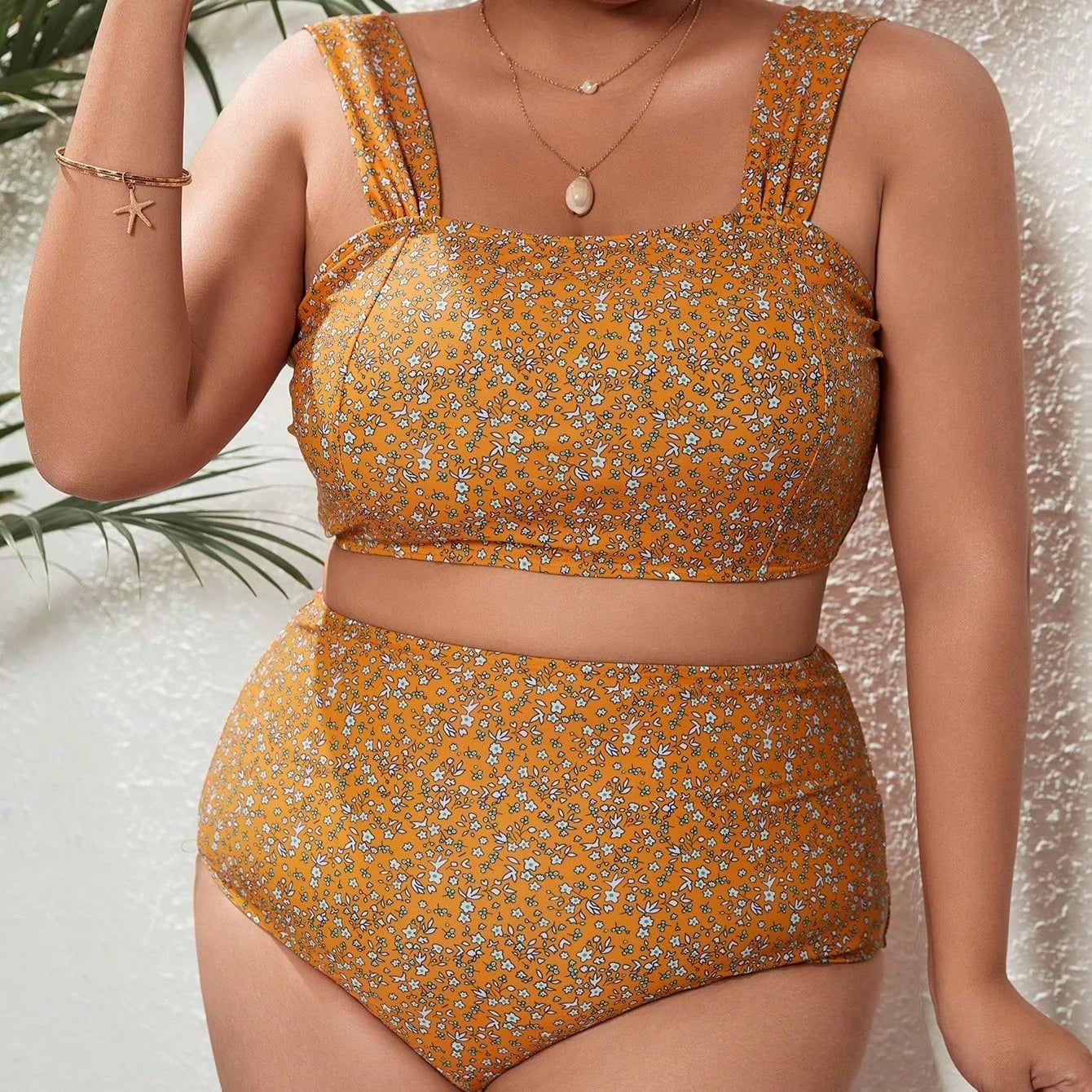 A chic plus size bikini designed for elegance and comfort. The top features a high, princess-style neckline with wide adjustable straps that include gentle ruching for a refined touch. The matching high-waist bottom enhances curves and provides secure coverage, available in multiple prints and colors. A perfect blend of support and summer style.