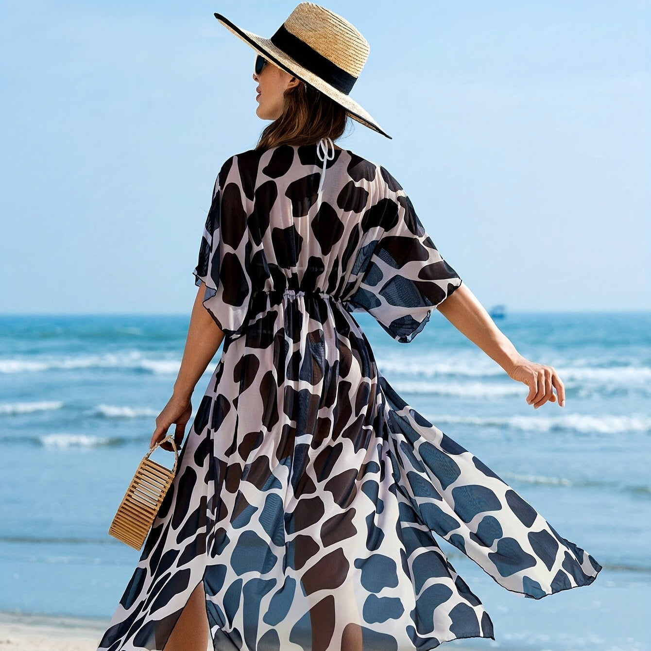 This lightweight leopard-print mesh cover-up with flowing batwing sleeves was made for women who own their presence.
