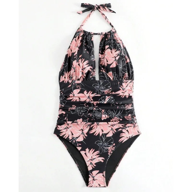 A one-piece swimsuit with delicate floral prints. Designed with a halter neckline and tie-back, it features a stylish cut-out at the bust and ruched draping around the waist for a flattering silhouette. Perfect blend of elegance, comfort, and durability.