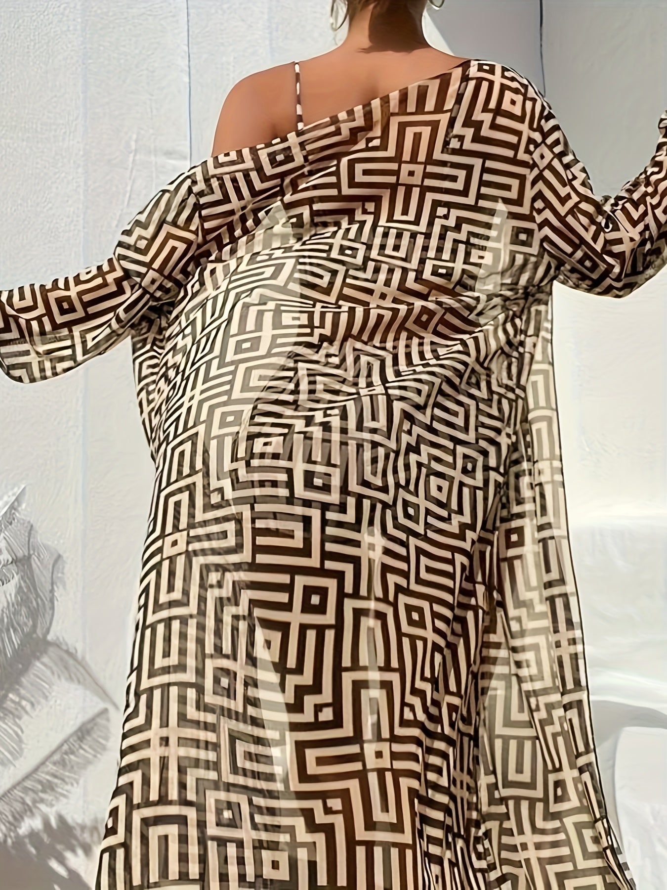 Delicate and versatile, this three-piece set combines style and practicality. The high-waisted shorts bottom provides comfort and security, while the top with an adjustable tie detail at the bust creates a flattering ruched effect. To complete the look, it includes a long-sleeve cover up in the same print for a coordinated, sophisticated finish.