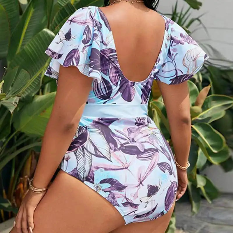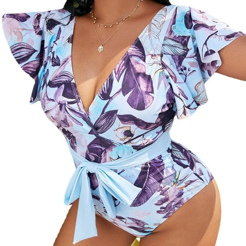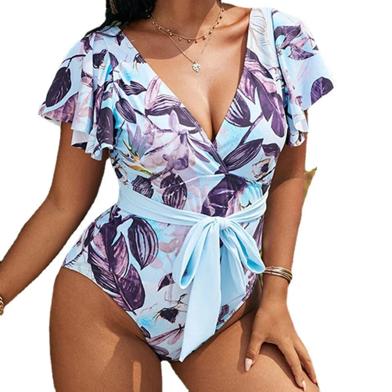 Elegant and flattering in an all-over floral print. This one-piece features a V-neckline at the front, a smooth round back, and charming ruffled sleeves that frame the shoulders. A wide fabric belt ties at the waist to define the silhouette with a feminine finish.
