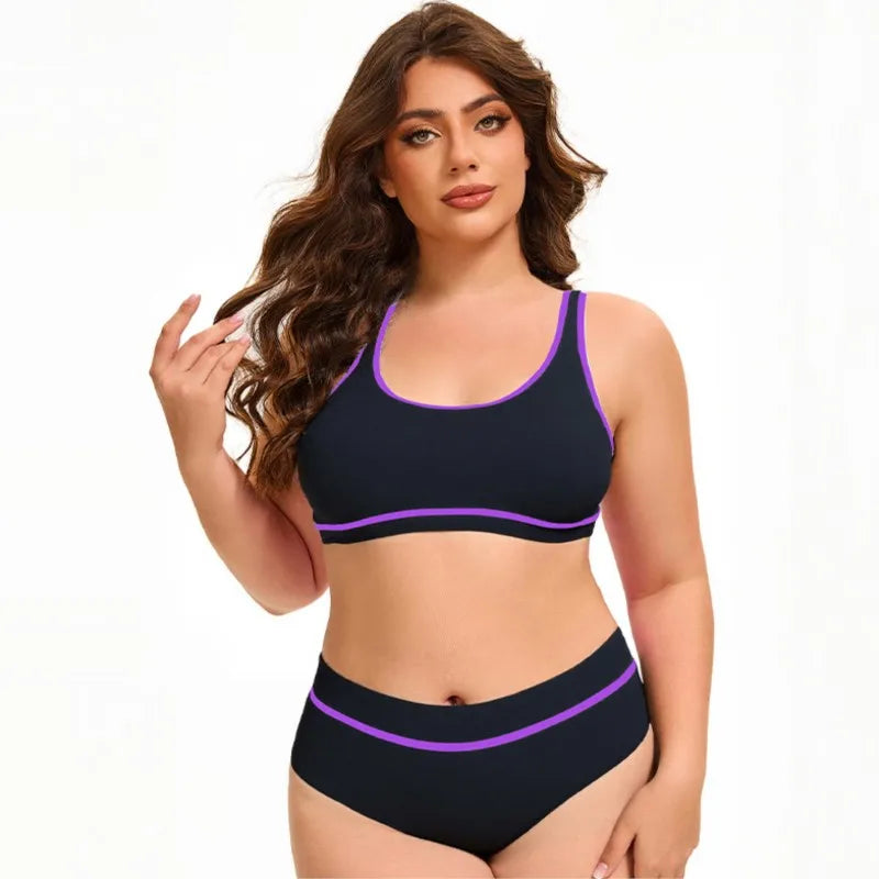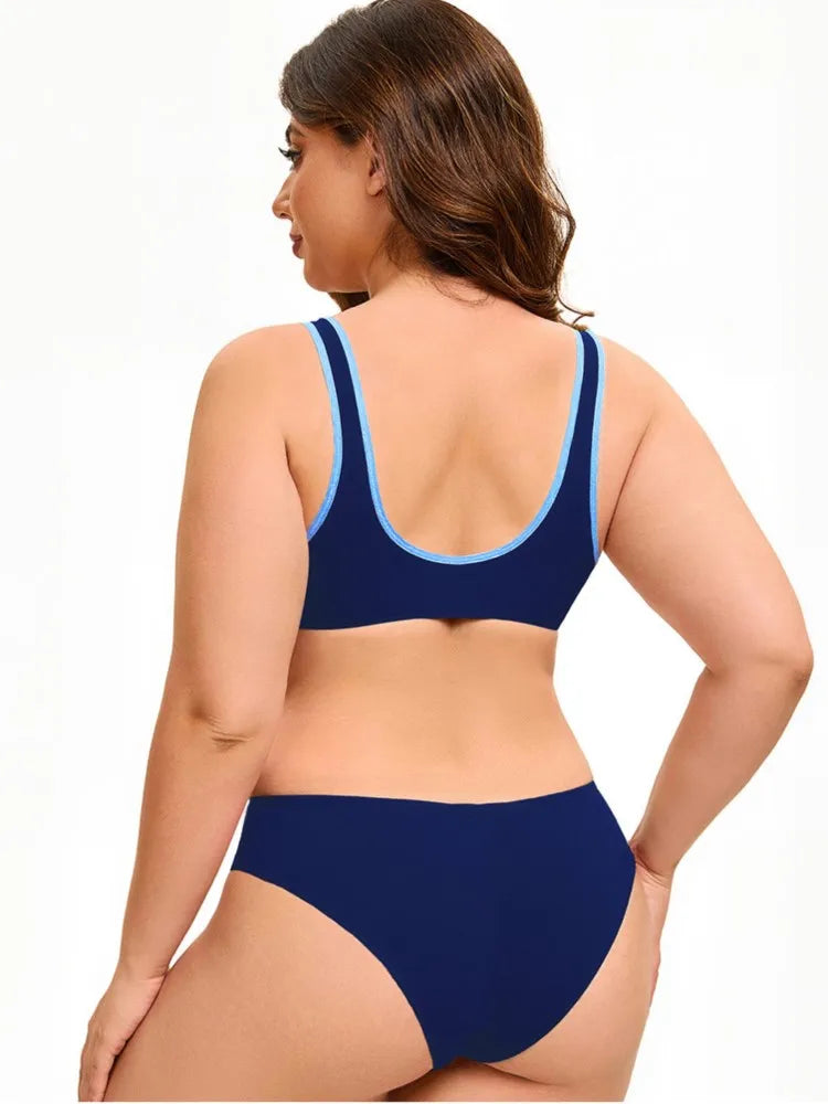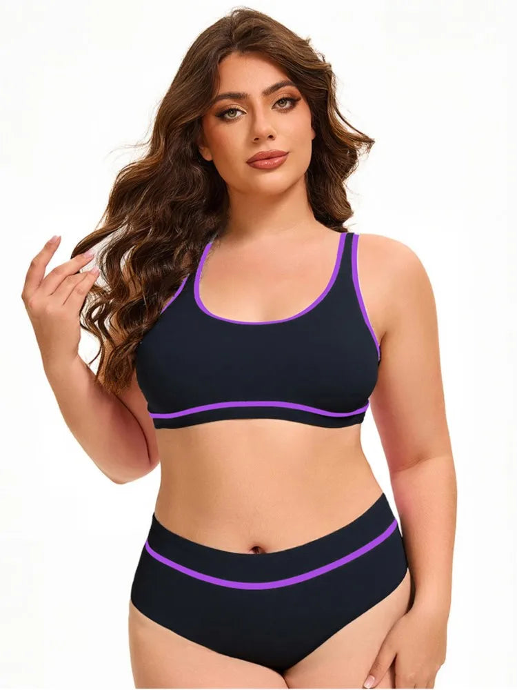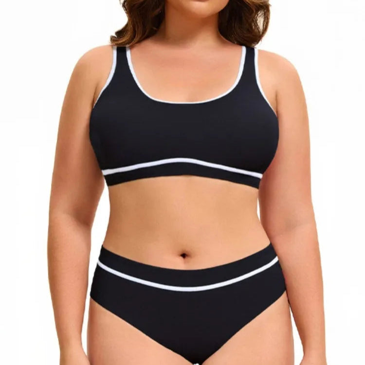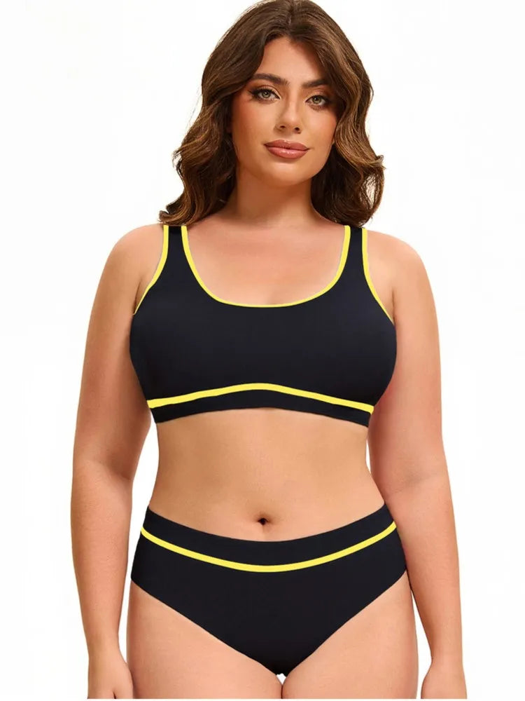 Solid Color Plus Size Bikini – Scoop Neck & Contrast Stripe Trim