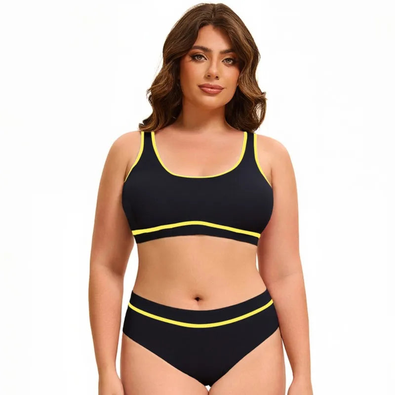 Clean and modern, this plus size bikini brings refined style with everyday comfort. The solid-color top features a scoop neckline, wide fixed straps, and a pull-on design (no hooks or ties). A colorful contrast stripe trims the entire neckline and runs along the underbust band for a sporty-chic touch. The matching high-waist bottom includes the same stripe detail just below the waistband to complete the coordinated look.