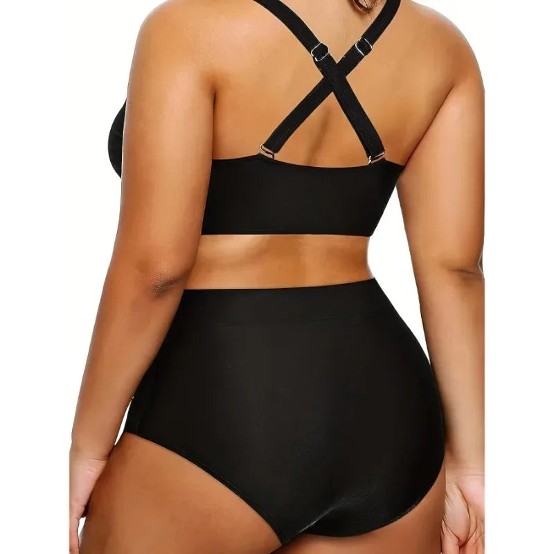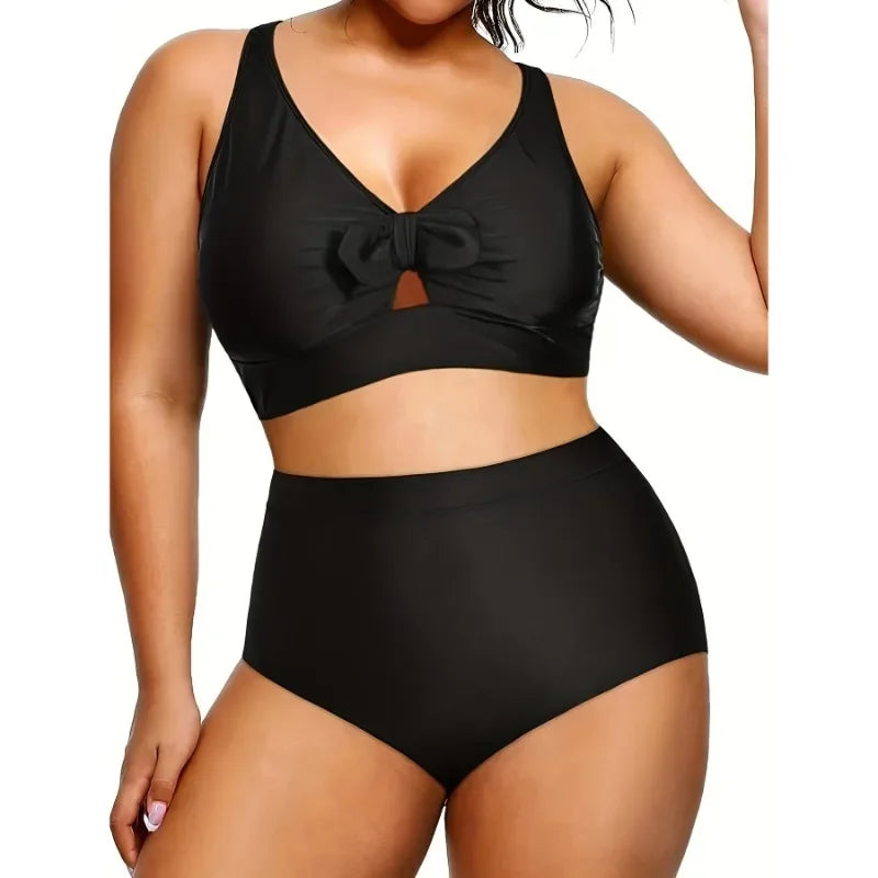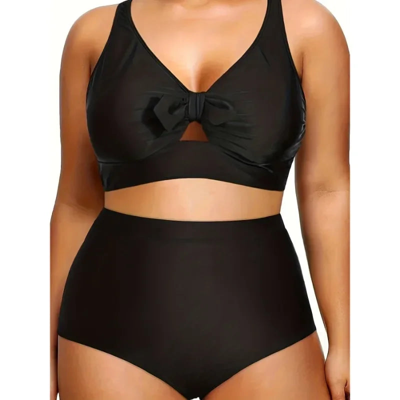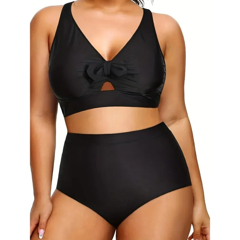 A sleek black bikini designed to flatter. The top features a V-neckline with a delicate bow joining the cups and a subtle keyhole cutout below the bust. Adjustable straps cross in an X at the back, paired with a straight-across back and easy pullover wear (no clasp, no tie). The matching high-waist bottom provides smoothing coverage for a balanced look.