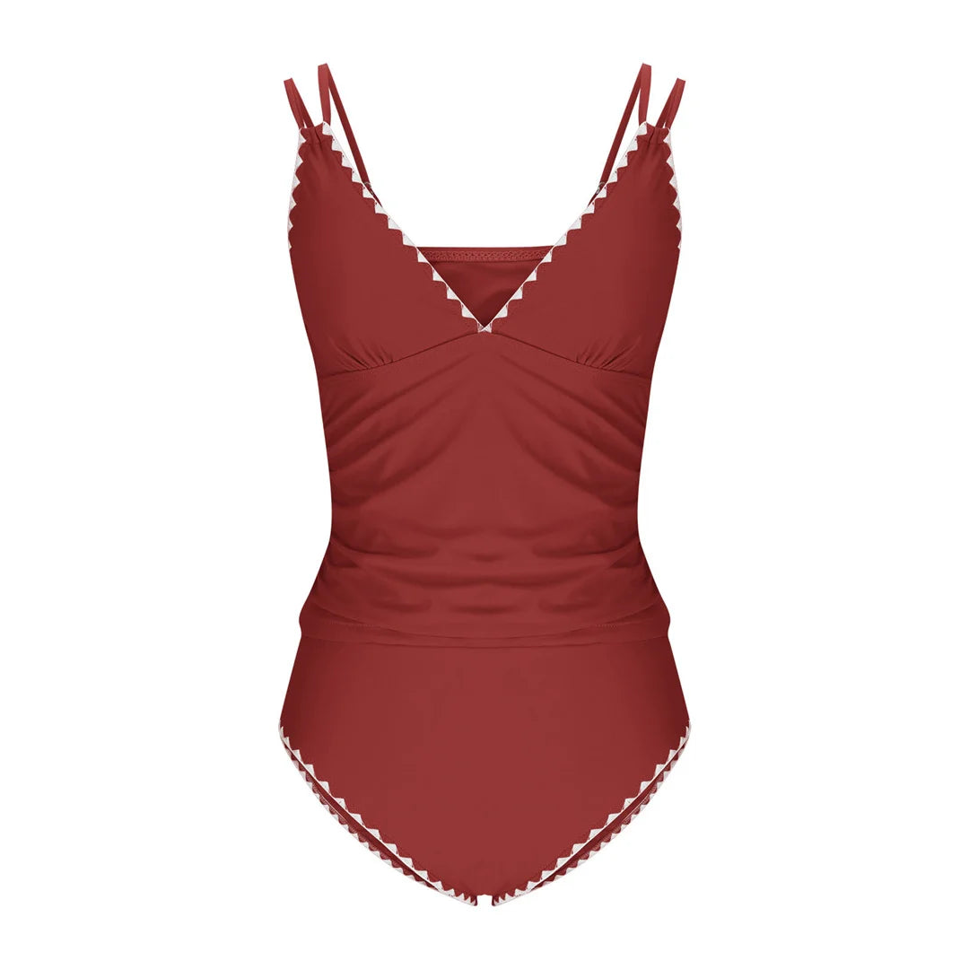 Simplicity with a touch of elegance — this tankini set brings classic design with refined details. The solid-colored top features a flattering V-neckline, thin fixed straps, and a straight-cut back for a sleek silhouette. The unique charm lies in the white contrast trim along the bust and shorts, adding sophistication to the look. Paired with solid shorts featuring the same refined trim, this set is perfect for those who love minimalist style with a modern twist.