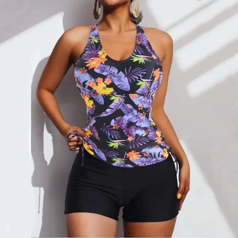 Fresh, feminine, and flattering — this two-piece tankini brings the perfect mix of style and function. The fitted floral tank top features adjustable side ties that allow ruching for a personalized fit. Fixed straps cross at the back in a stylish X-shape, combined with a straight-cut design for secure support. The solid-color shorts coordinate with the floral top, completing a balanced and chic look. Ideal for beach days, swimming, or vacations, this set combines confidence and comfort effortlessly.
