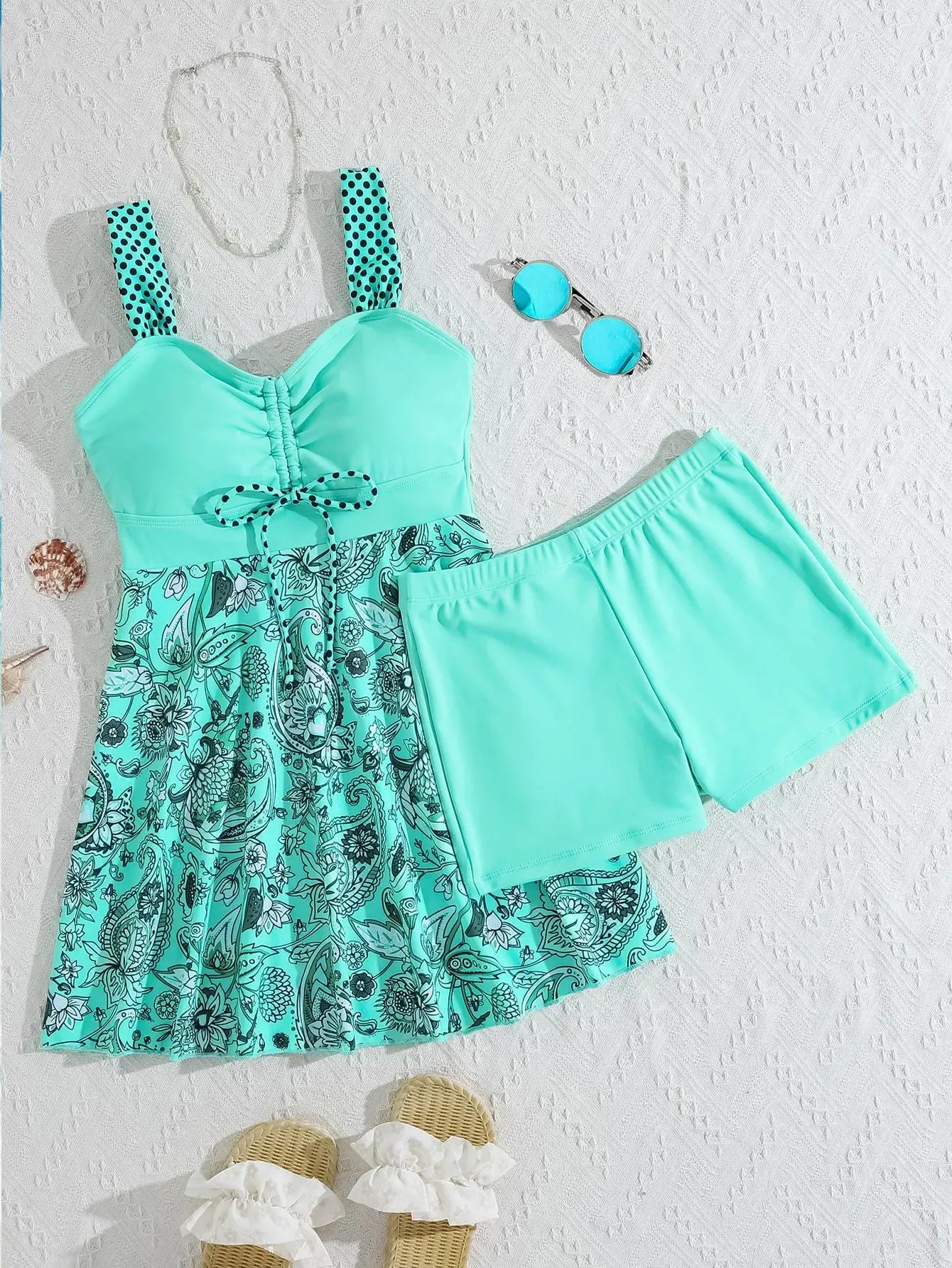 - Bottom: Solid high-waist shorts for comfort and coverage