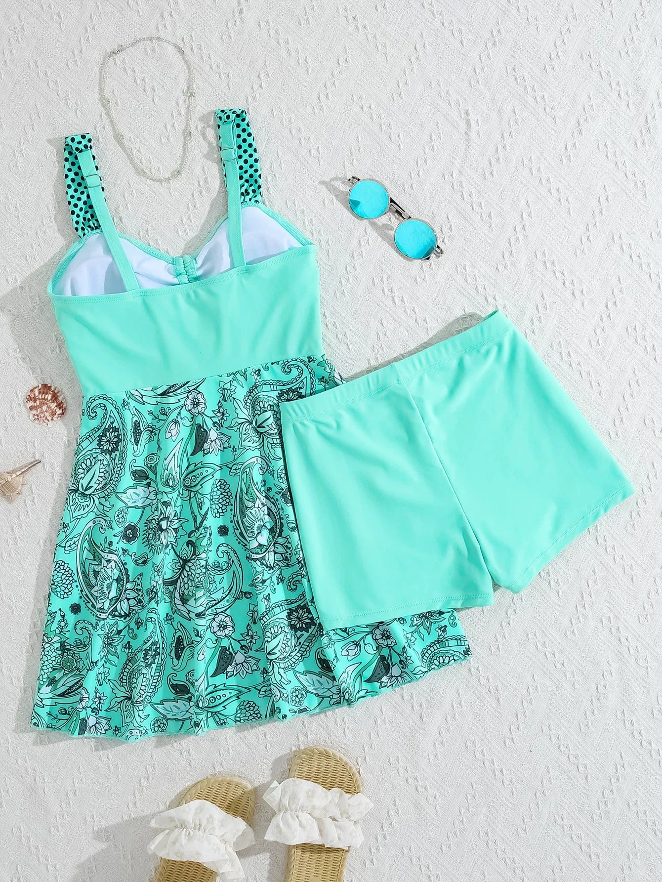 This two-piece tankini set is designed to combine style with comfort. The top features wide adjustable straps, a straight back neckline, and a unique vertical tie detail at the bust that creates a subtle ruched effect. From the bust down, the printed fabric adds a colorful and eye-catching touch, while the solid shorts balance the look with a sleek finish. With its high-waist design, this set flatters the waistline and delivers a confident silhouette, perfect for beach days, poolside, or resort vacations.