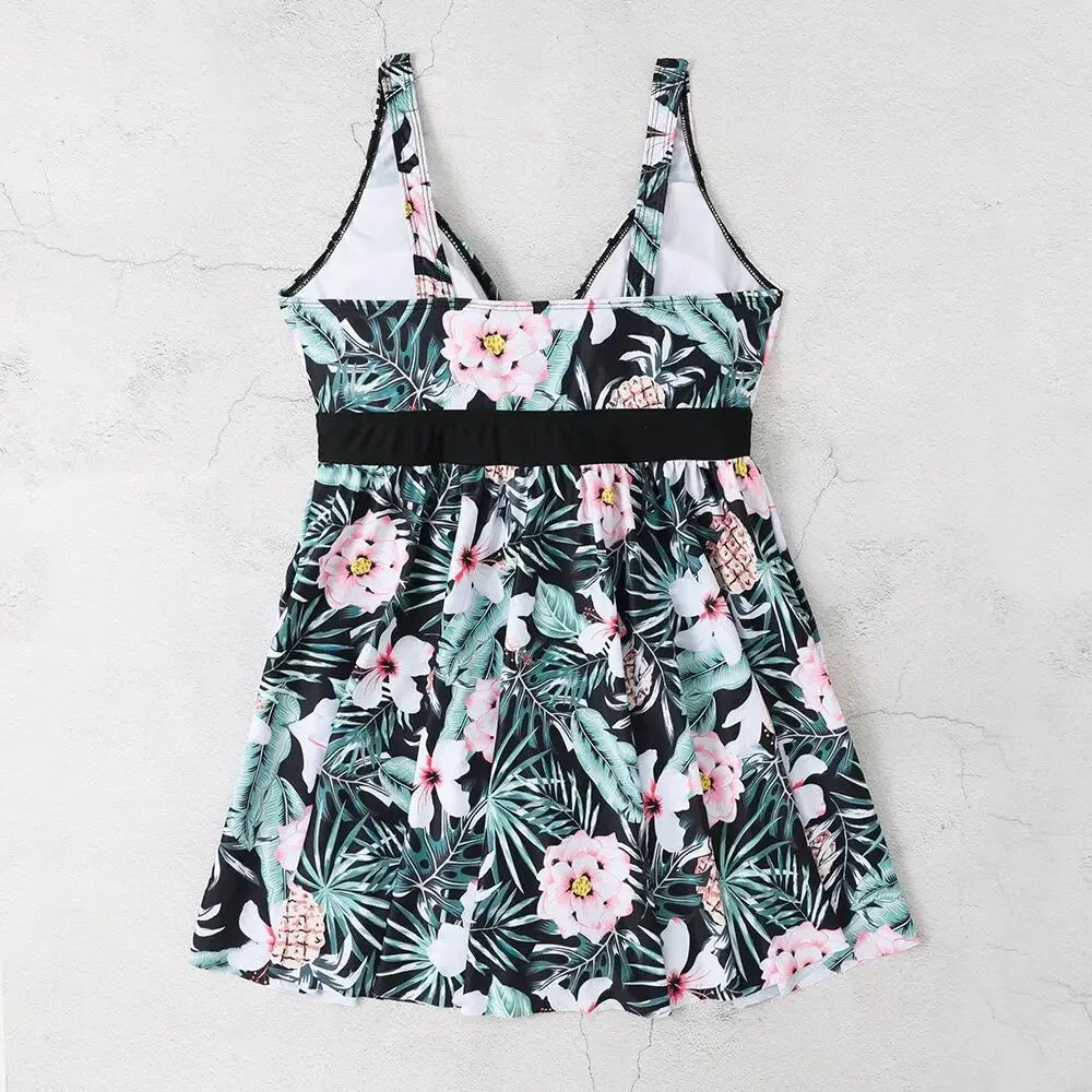 Elegance meets comfort in this floral tankini set. The printed tankini features a flattering V-neckline and a solid-color band under the bust that ties at the center, creating a belted effect for a defined silhouette. The solid top detail matches perfectly with the floral print, while the straight-cut back and fixed straps ensure a secure fit. Paired with floral shorts, this set brings harmony between charm and practicality — perfect for poolside, vacations, and sunny escapes.