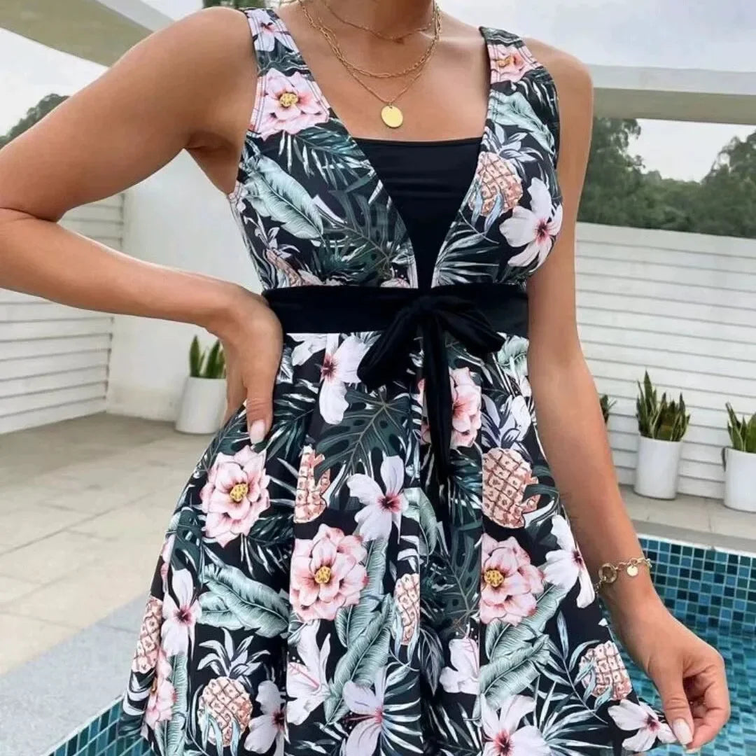Floral Belted Tankini Set – V-Neck & Printed Shorts