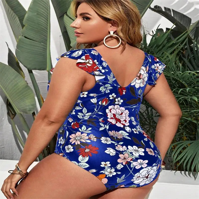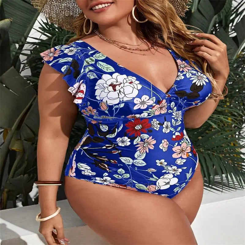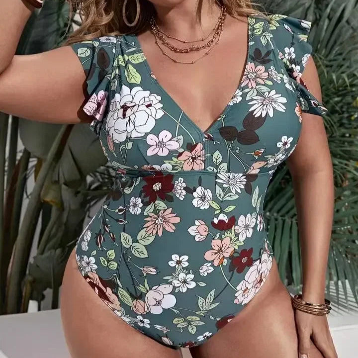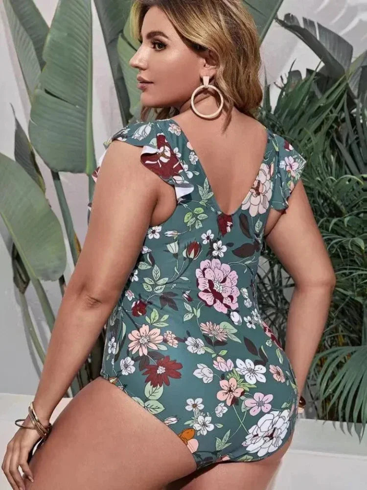 Chic one-piece with a floral print. It features a flattering V-neckline at the front and ruffled shoulder straps that add a feminine touch. Pullover design for easy wear.