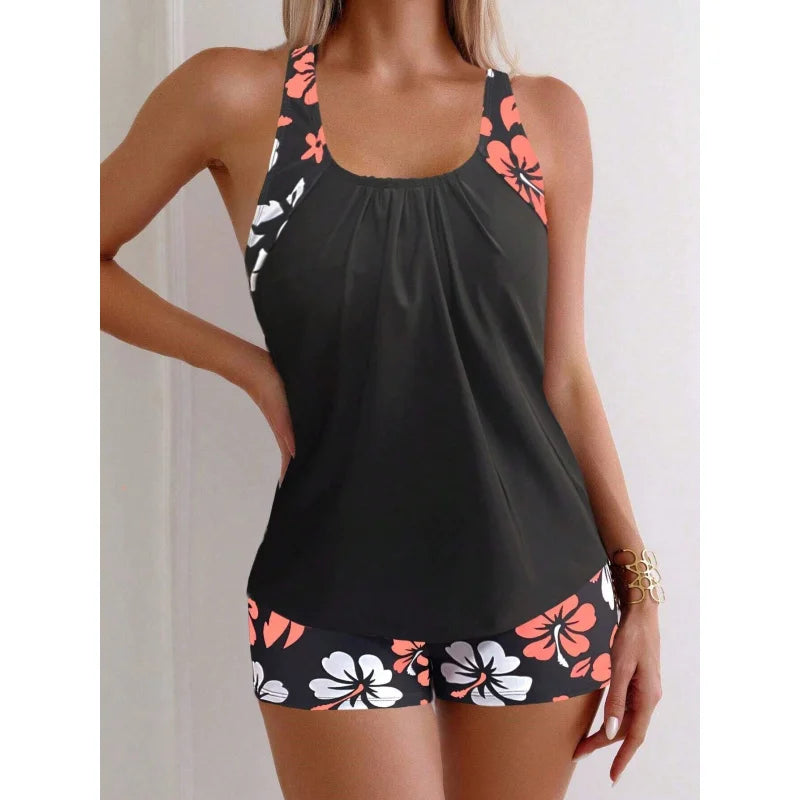 A versatile and elegant tankini set designed with a black base and printed accents. The V-neck tank top features a subtle ruched detail at the bust and adjustable spaghetti for a personalized fit. Floral shorts, this two-piece swimsuit blends comfort and style. Perfect for beach days, hot springs, or summer vacations.
