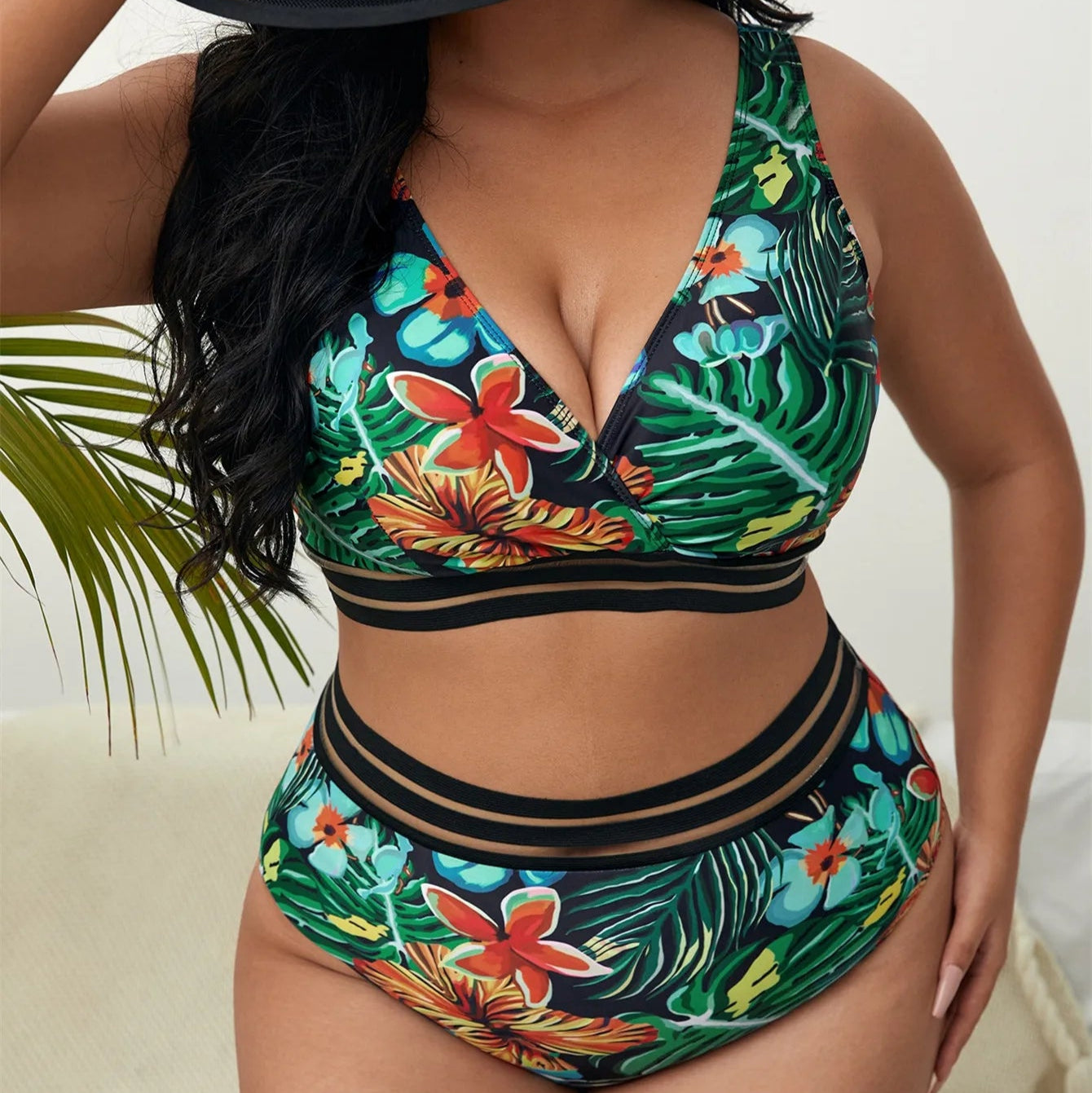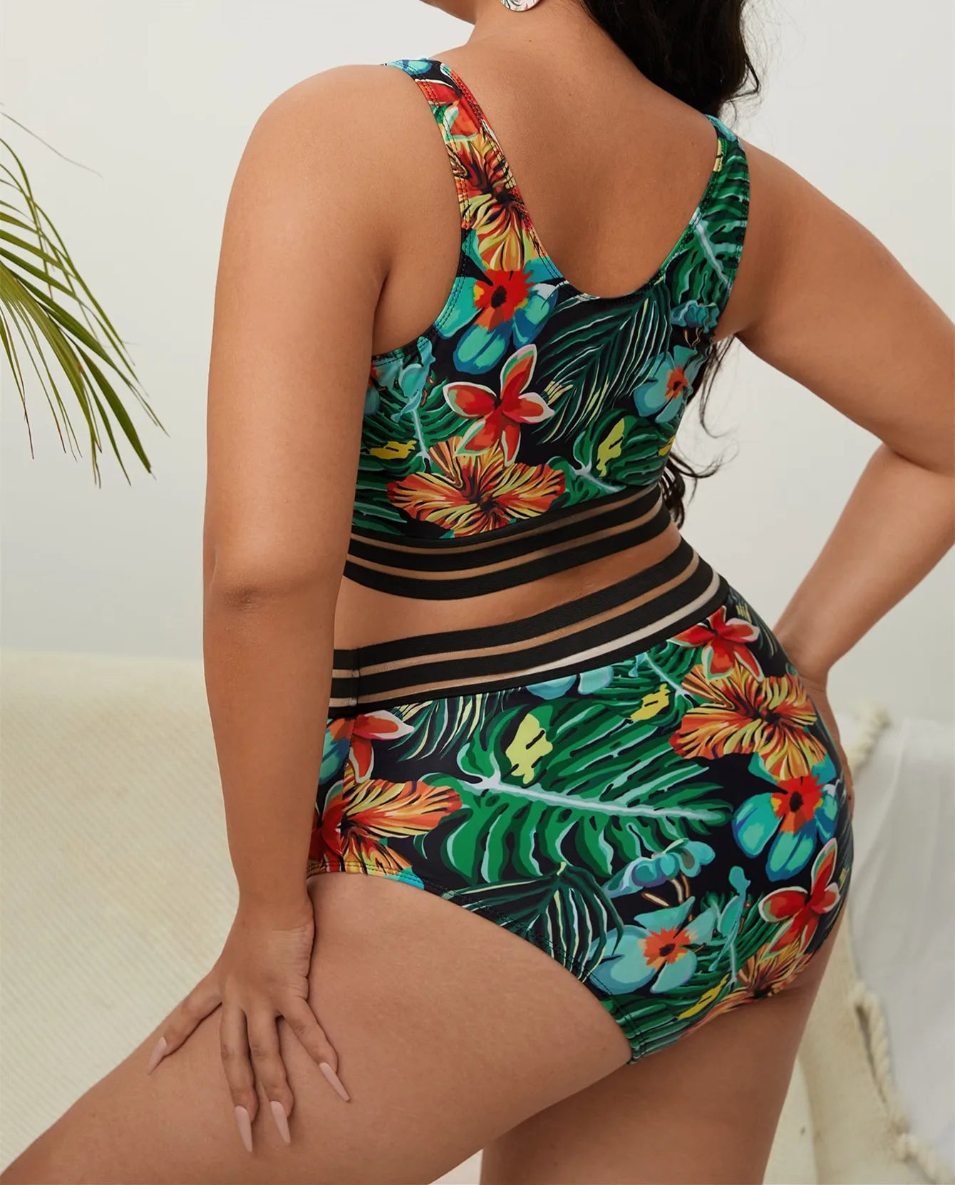 A chic two-piece set that balances coverage and style. The black-base floral top features a flattering V-neckline and a high racerback that keeps the back mostly covered. Both pieces showcase a sleek black contrast waistband — underbust on the top and at the waist on the bottom — to define your silhouette. The high-waist bottom delivers a smooth, comfortable fit.