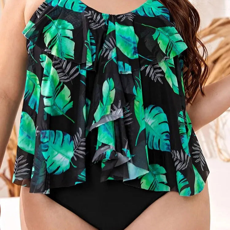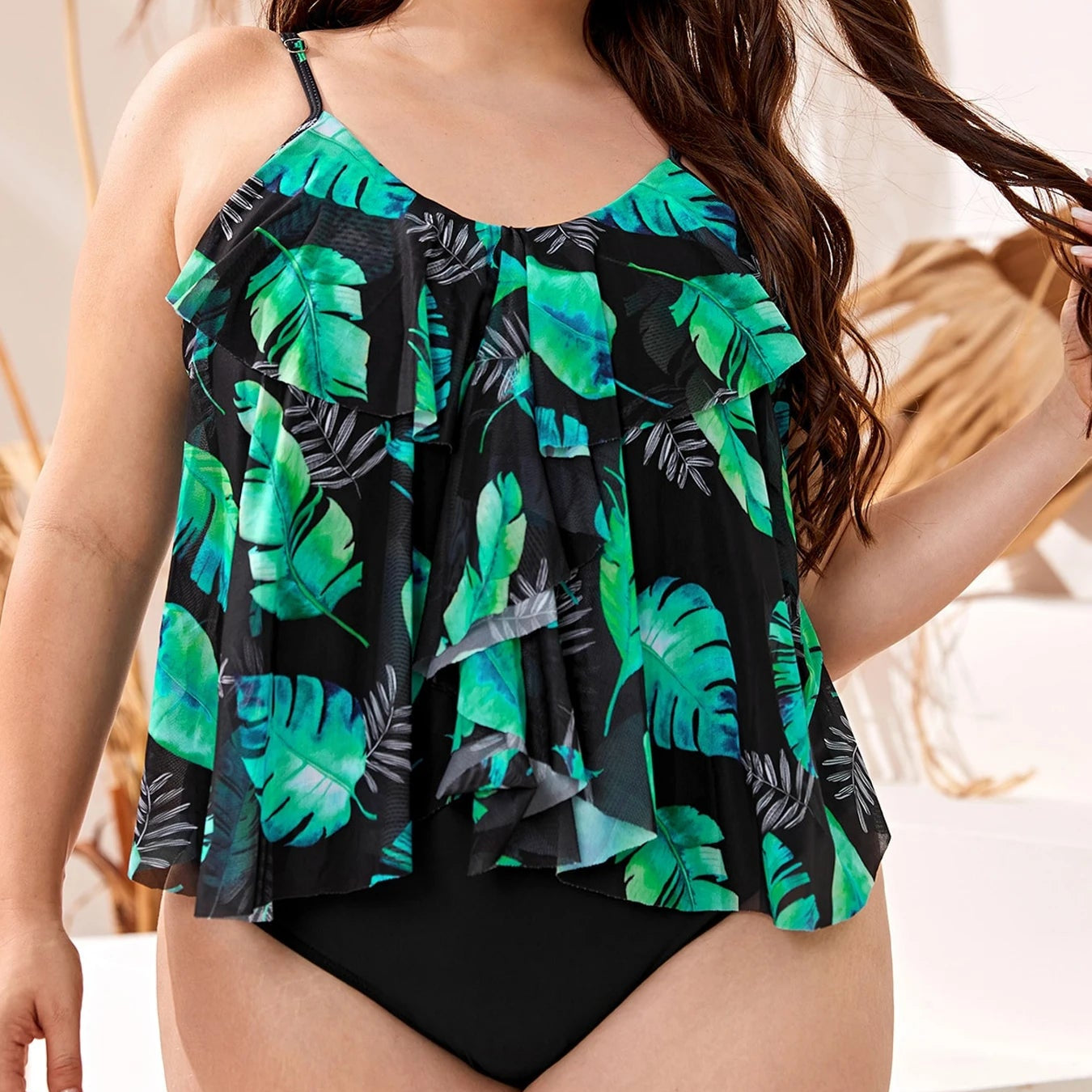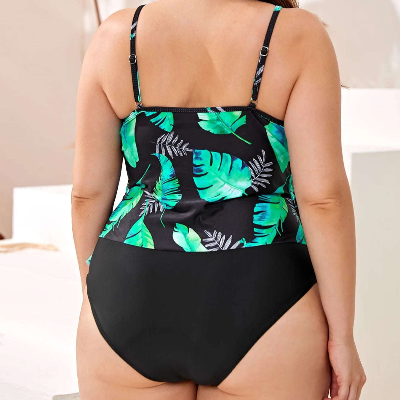 A confidence-boosting two-piece tankini designed to celebrate curves. The tank-style top features a V-neckline and ruched front that smooths the midsection, plus adjustable straps for a customized fit. The matching high-waist bottom offers comfortable coverage with a sleek, modern silhouette.