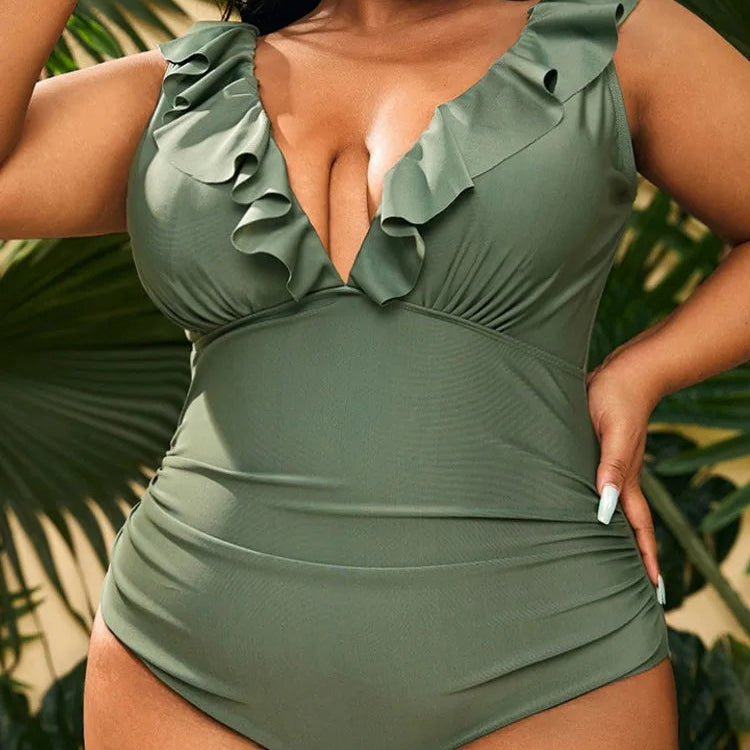 Chic and feminine, this plus size one-piece swimsuit is designed to highlight your curves with elegance. The deep V-neckline features gentle ruching at the bust and a playful ruffle trim that runs along the neckline and continues to the back. With its open back and fixed straps, this swimsuit blends comfort with sophistication, making it perfect for beach days, vacations, or resort escapes.