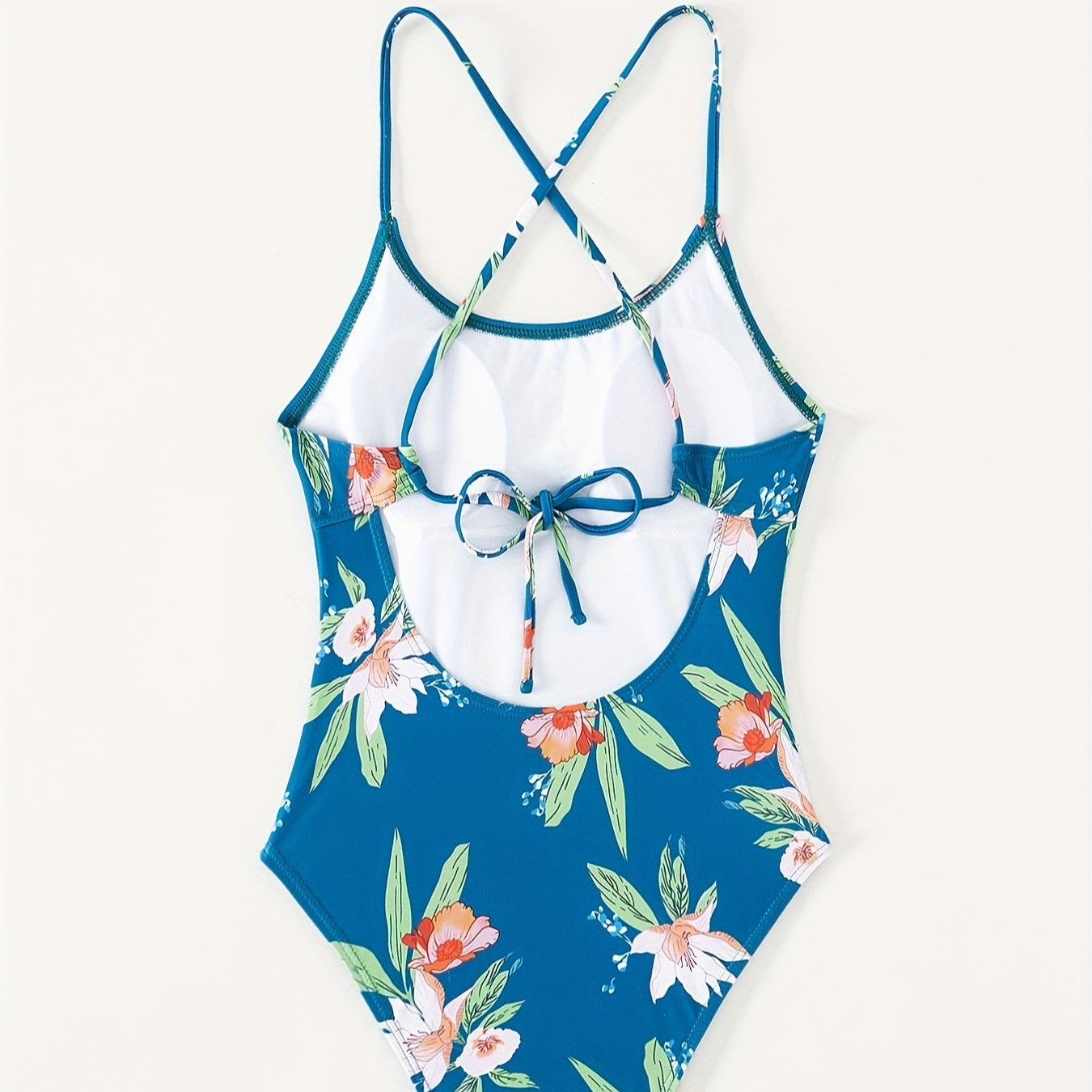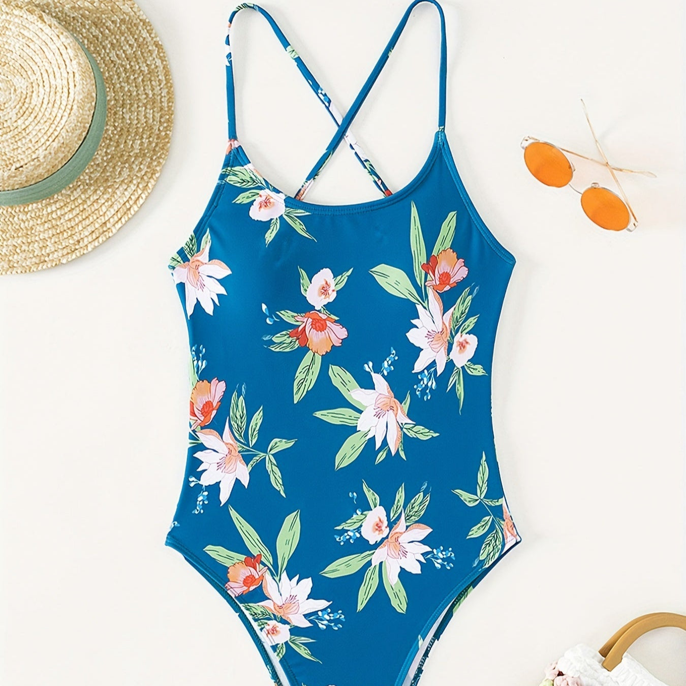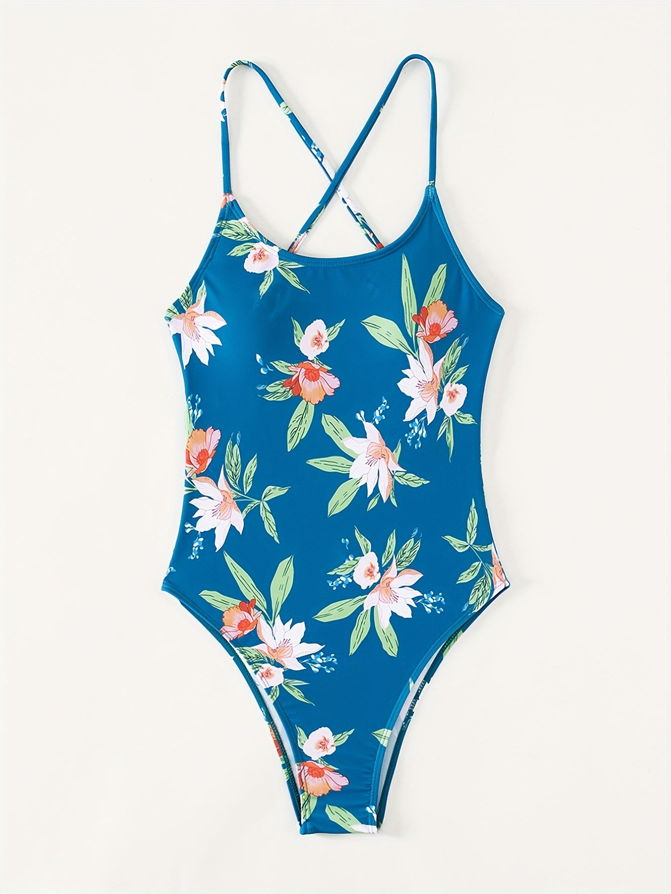 A stylish tropical floral one-piece swimsuit featuring and an adjustable tie closure that crosses into an elegant X-back design. The high-stretch fabric ensures comfort and flexibility, while removable chest padding offers customizable support. Perfect for vacations, beach days, and poolside lounging.