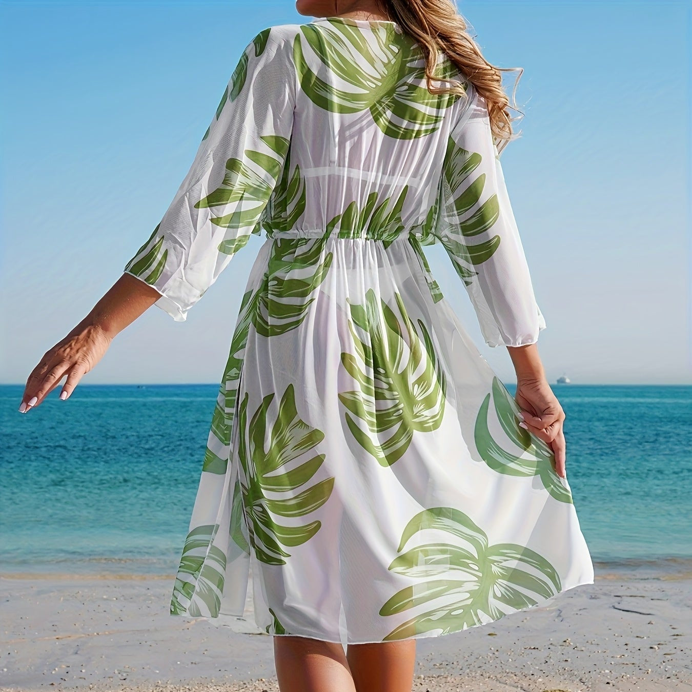This mid-length beach cover-up blends the elegance of a white base with the natural charm of green leaf prints, creating a tropical yet refined aesthetic. Featuring long sleeves and an adjustable waist tie, it flatters your silhouette effortlessly while keeping things breezy and relaxed.